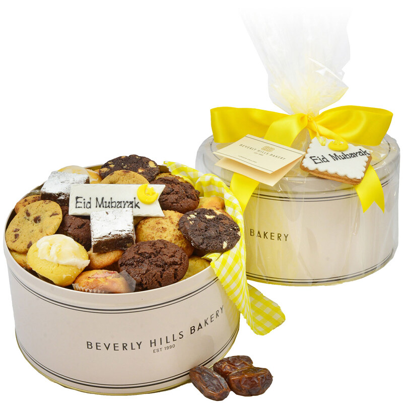 Celebrate Eid and enjoy your festivities with our delicious gift tin of mini muffins, cookies, brownies, and added dates, decorated in yellow gingham cloth and ribbon, with hand made cookie plaques wishing yourself and your loved ones "Eid Mubarak".