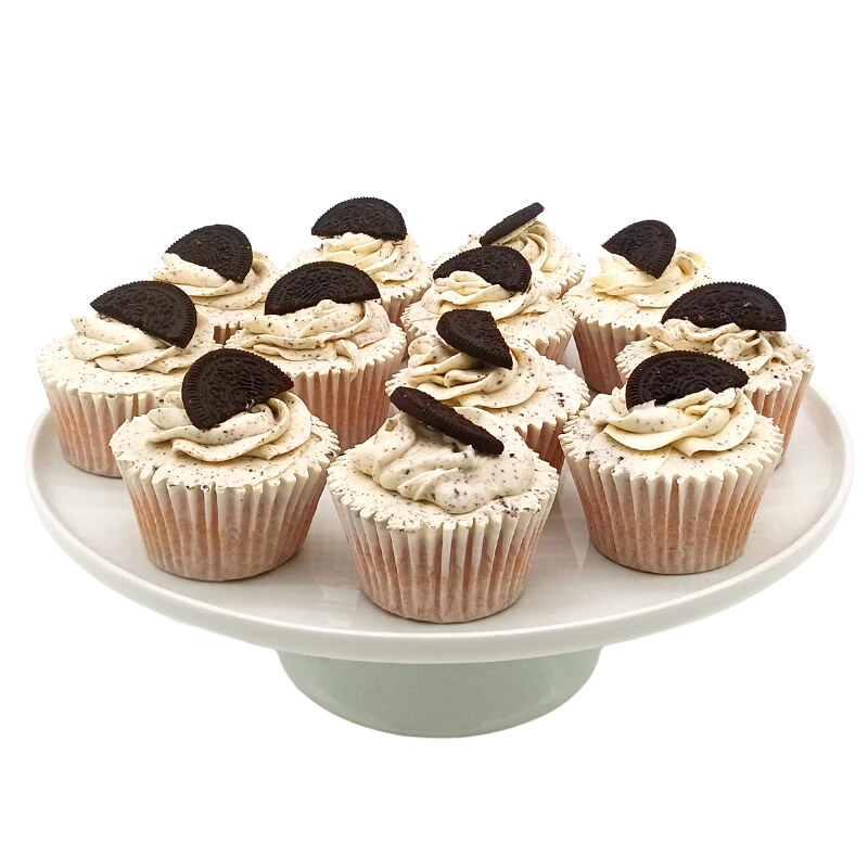 Our newest Cookies & Cream cupcakes are made with vanilla sponge and cream cheese frosting topped with Oreo cookie halves and Oreo crumb sprinkles!